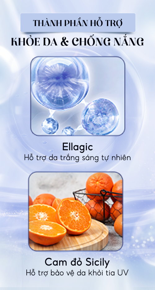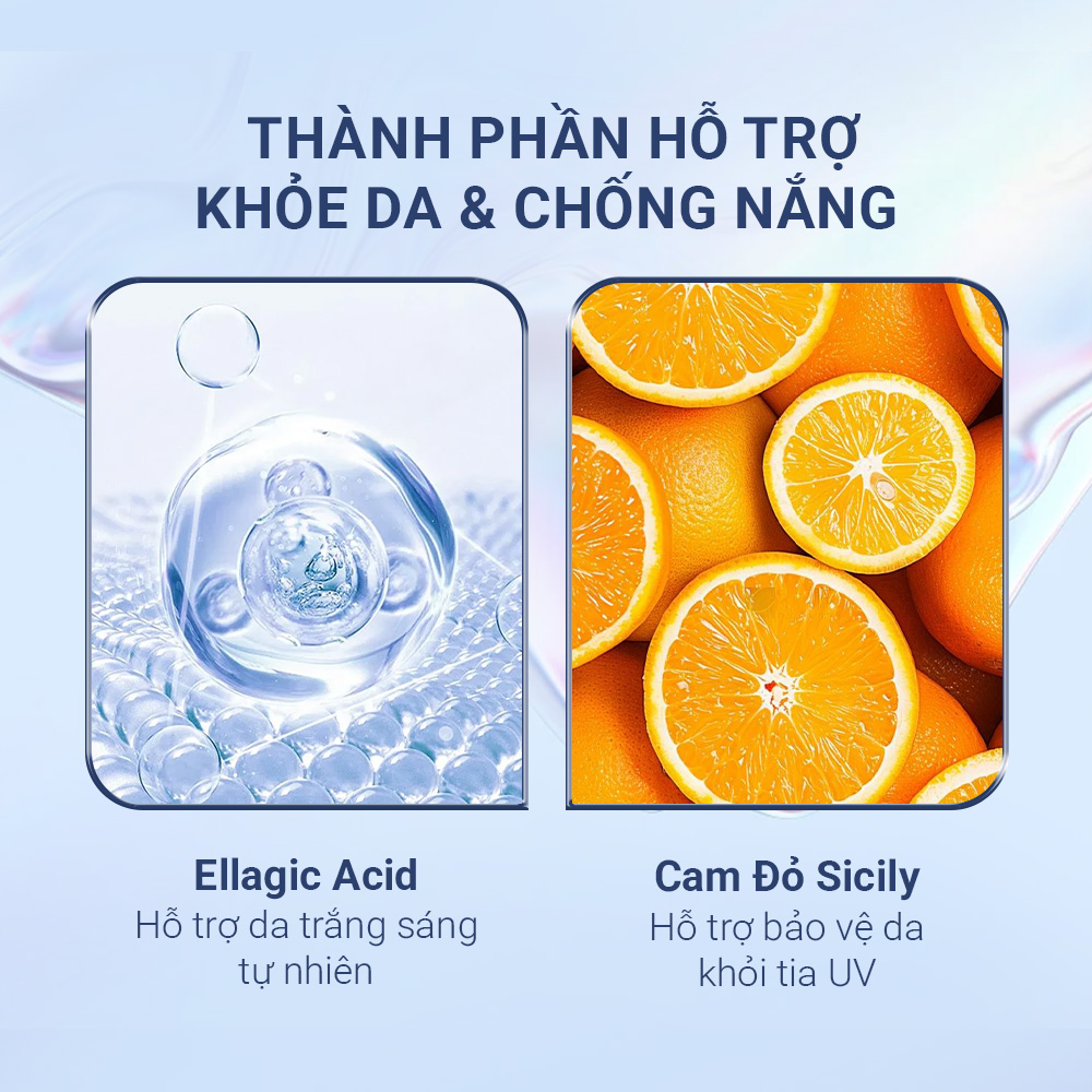 Công dụng: Hỗ trợ hạn chế quá trình oxy hóa, hỗ trợ tăng tính đàn hồi cho da, làm giảm nám, sạm da giúp cho da sáng mịn.