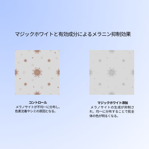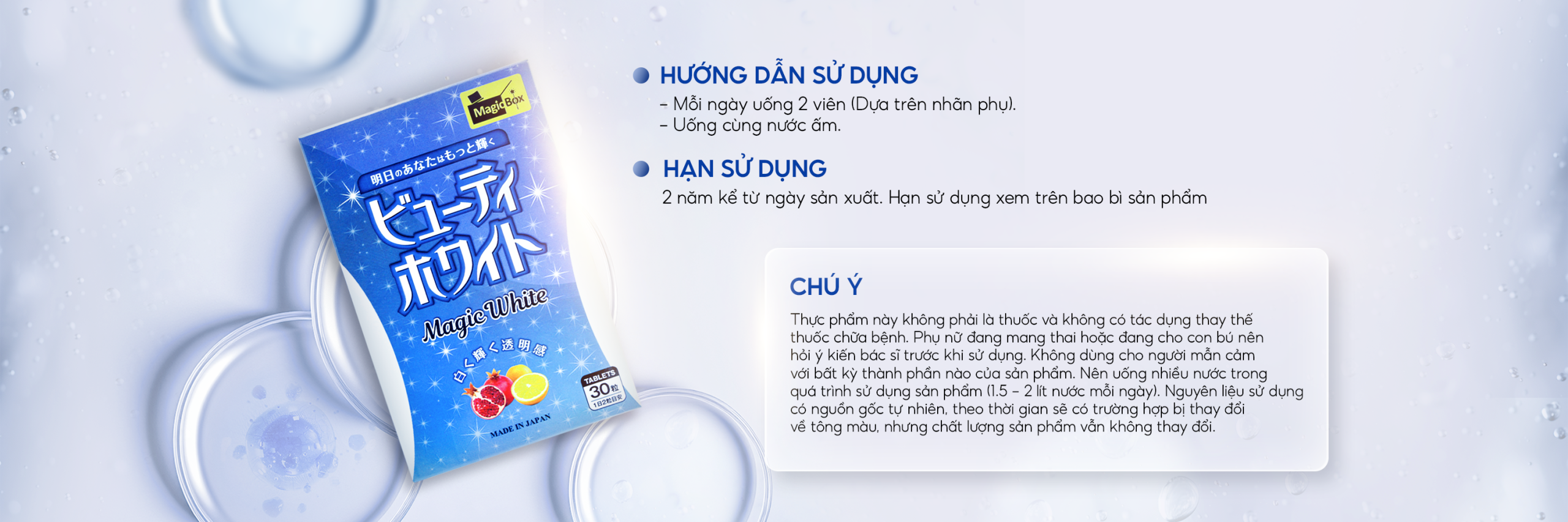 Magic White ứng dụng công thức độc quyền kết hợp Chiết xuất Cam Đỏ Sicily và Lựu Đỏ Aomori giàu Vitamin C, cùng L-Cystine tinh khiết và Vitamin B3. Sản phẩm giúp tăng cường tổng hợp collagen, cải thiện độ đàn hồi, nhờ đó, làn da được tái tạo từ bên trong, trở nên trắng sáng, mịn màng và đều màu một cách an toàn, bền vững.